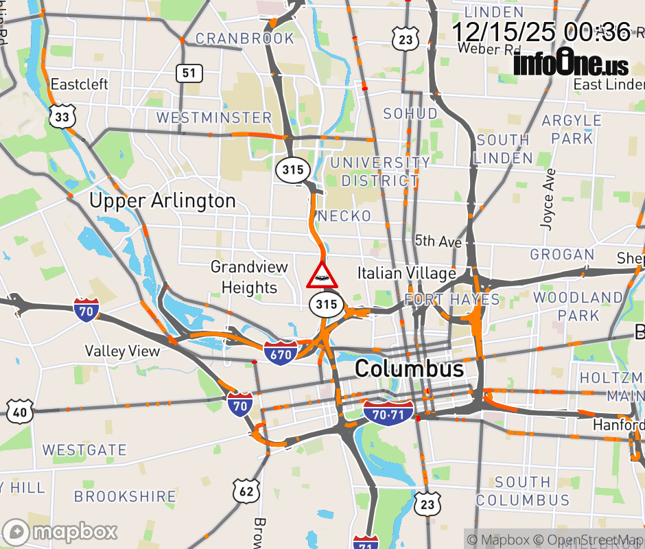 The right lane is closed on SR-315 South at I-670 East, due to a crash. Updated: Mon 12/15/25 12:36 AM EST ![]() Updated: Mon 12/15/25 12:36 AM EST |