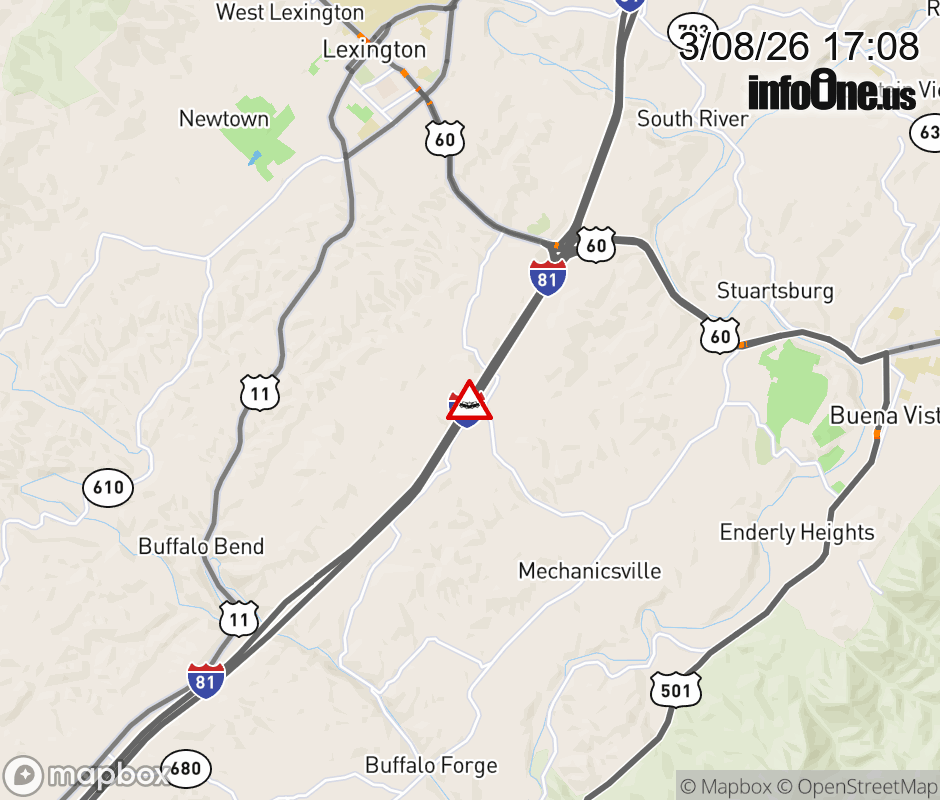 On I-81 at mile marker 187.1 in the County of Rockbridge, motorists can expect delays due to a vehicle crash. The south left shoulder and left lane are closed. Traffic backups are approximately 1.0 mile. Updated: Sun 3/8/26 5:08 PM EDT ![]() Updated: Sun 3/8/26 5:08 PM EDT |