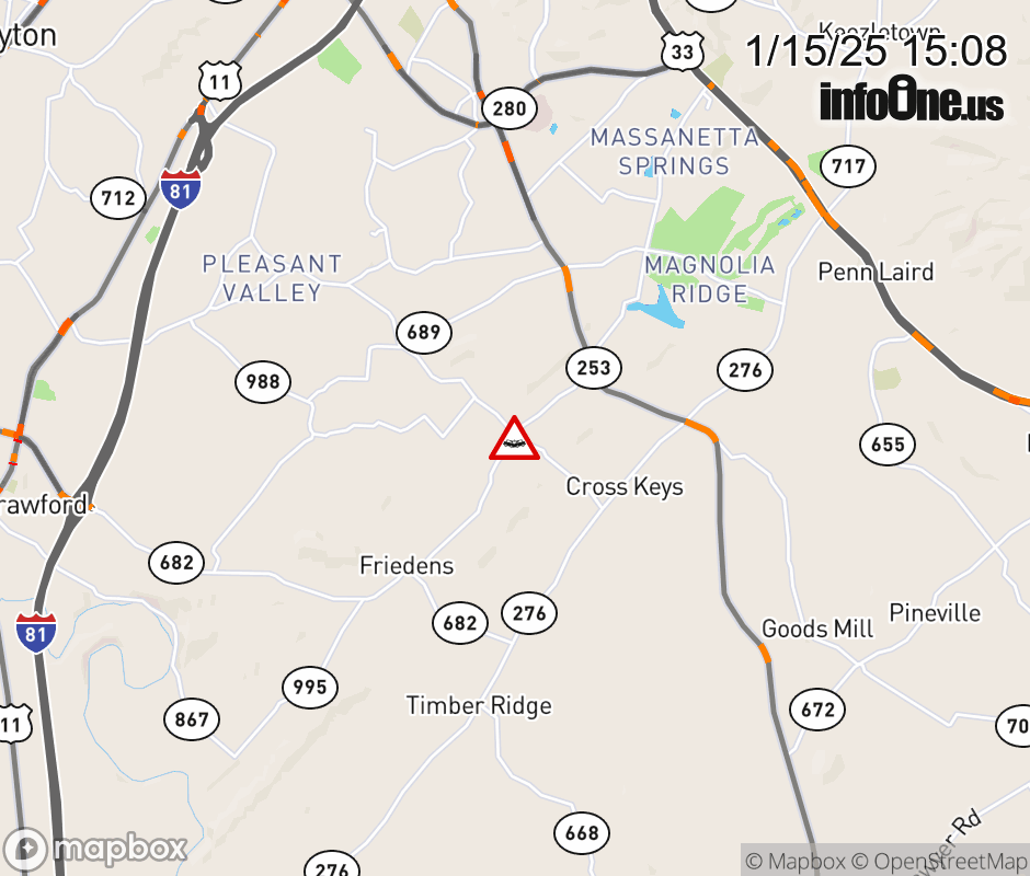On Rt. 680 in the County of Rockingham, in the vicinity of Pleasant Valley Rd; Rt. 679E/W (Rockingham County), motorists can expect delays due to a vehicle crash. All north lanes are closed. All south lanes are closed. ![]() |