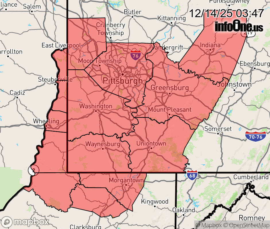 Canceled 12/14/25 9:16 AM Winter Storm Warning issued December 14 at 3:46AM EST until December 14 at 1:00PM EST by NWS Pittsburgh PA * WHAT... Heavy snow expected. Total snow accumulations between 6 and 8 inches. Winds gusting as high as 35 mph. * WHERE... Portions of southwest and Roads will be slick and hazardous. Plan on slippery road conditions.western Pennsylvania and northern and the northern panhandle of West Virginia. * WHEN... Until 1 PM EST this afternoon. * IMPACTS... Roads will likely be slick and hazardous. Travel could be very difficult. ![]() |