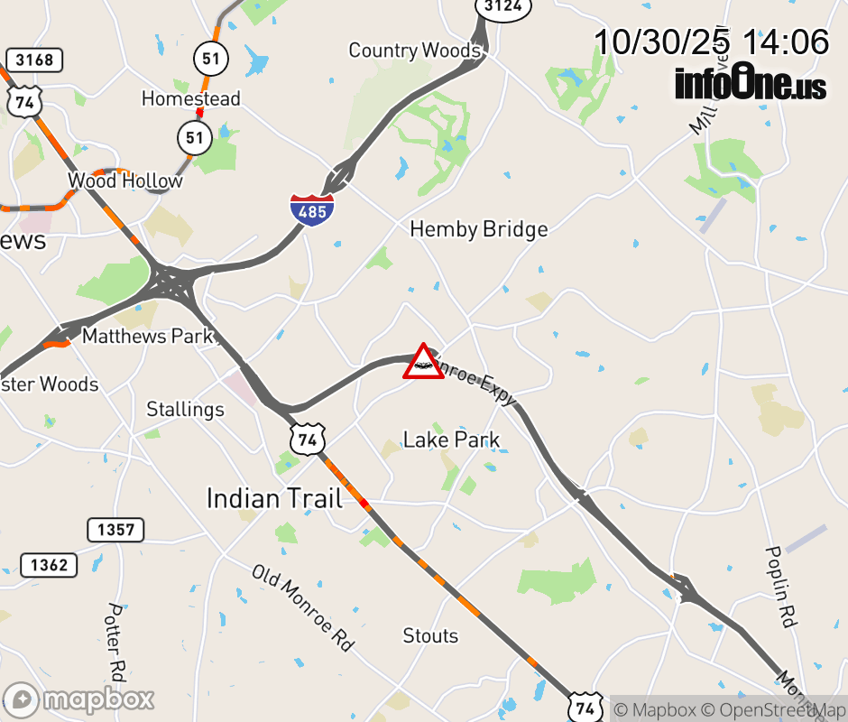 The right lane is closed past Exit 257 (Indian Trail Fairview Rd) ![]() Updated: Thu 10/30/25 2:06 PM EDT |