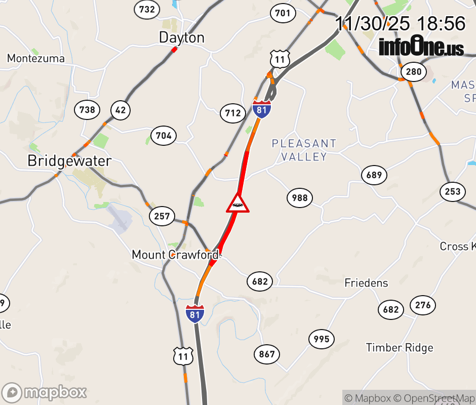 On I-81 at mile marker 241.1 in the County of Rockingham, motorists can expect delays due to a vehicle crash. The north left shoulder and left lane are closed. ![]() |