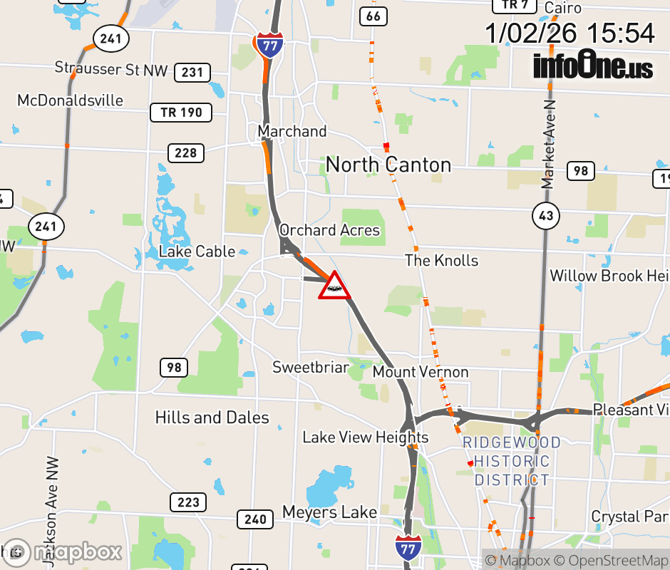 The right shoulder is blocked on I-77 South beyond Everhard Rd/Whipple Ave, due to a crash. ![]() |