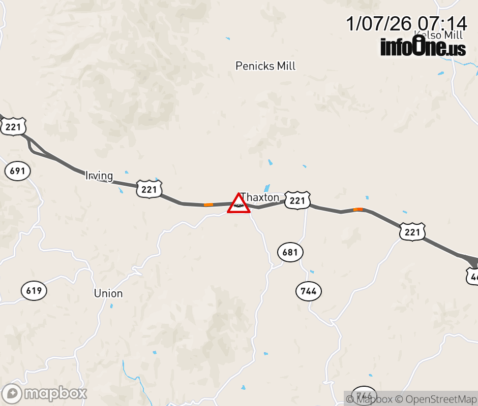 On US-460 West in the County of Bedford, in the vicinity of Thaxton School Rd; Rt. 831E/W (Bedford County), motorists can expect delays due to a vehicle crash. Lane closures exist. ![]() |