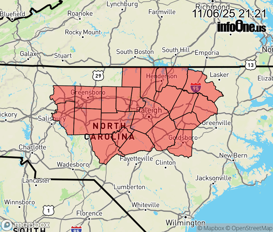 Canceled 11/7/25 1:30 AM Frost Advisory issued November 6 at 9:20PM EST until November 7 at 8:00AM EST by NWS Raleigh NC * WHAT... Temperatures as low as 33 will result in frost formation. * WHERE... The northern Piedmont, northern Sandhills, and northern and central Coastal Plain of central North Carolina. * WHEN... From 1 AM to 8 AM EST Friday. * IMPACTS... Frost could harm or kill sensitive outdoor vegetation or plants if left uncovered. ![]() |