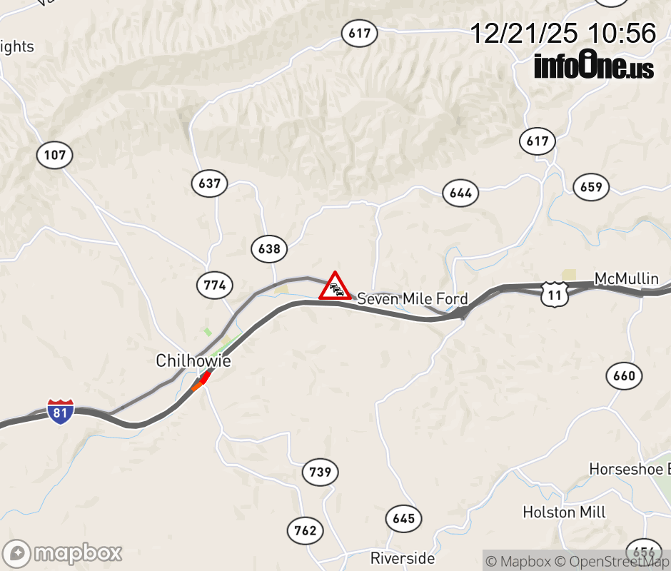 On US-11 in the County of Smyth, in the vicinity of Seven Mile Ford Rd; Rt. 642E/W (Smyth County), motorists can expect delays due to an incident. All south lanes are closed. ![]() |