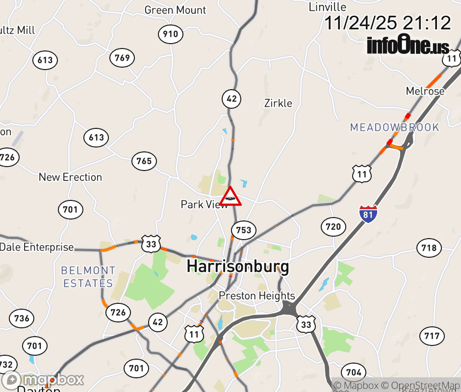On City Rt. 4121 West in the City of Harrisonburg, in the vicinity of Virginia Ave; VA-42N/S, motorists can expect delays due to a vehicle crash. Updated: Mon 11/24/25 9:12 PM EST ![]() Updated: Mon 11/24/25 9:12 PM EST |