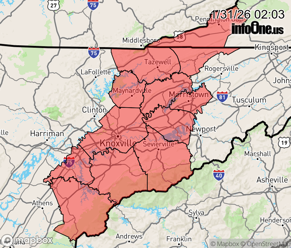 Canceled 1/31/26 12:47 PM Winter Storm Warning issued January 31 at 2:02AM EST until February 1 at 1:00AM EST by NWS Morristown TN * WHAT... Heavy snow. Additional snow accumulations between 2 and 5 inches expected in most valley locations. Additional snow accumulations between 5 to 8 inches are possible in southern portions of Monroe, Blount, Jefferson, and Sevier counties. Locally higher totals possible in foothills closest to mountains. * WHERE... Portions of east Tennessee and southwest Virginia. * WHEN... Until 1 AM EST Sunday. * IMPACTS... Hazardous travel conditions are expected. ![]() |