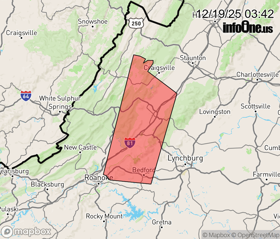 Canceled 12/19/25 4:15 AM Special Weather Statement issued December 19 at 3:40AM EST by NWS Blacksburg VA At 339 AM EST, Doppler radar was tracking heavy rain showers along a line extending from 8 miles northeast of Burnsville to near Laymantown. Movement was east at 55 mph. HAZARD...Wind gusts up to 50 mph. SOURCE...Radar indicated. IMPACT...Gusty winds could knock down tree limbs and blow around unsecured objects. Locations impacted include... Lexington... Buena Vista... Bedford... Buchanan... Glasgow... Troutville... and Goshen. ![]() |