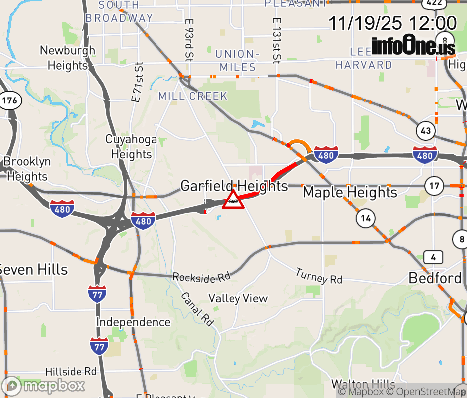 The 2 left lanes are blocked on I-480 West beyond SR-14/Broadway Ave, due to a crash. Updated: Wed 11/19/25 12:00 PM EST ![]() Updated: Wed 11/19/25 12:00 PM EST |