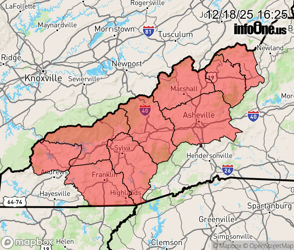 Canceled 12/18/25 9:28 PM Wind Advisory issued December 18 at 4:24PM EST until December 19 at 7:00PM EST by NWS Greenville-Spartanburg SC * WHAT... Northwest winds 15 to 25 mph with gusts up to 60 mph expected at elevations above 3500 feet. * WHERE... High elevations above 3500 feet in the following counties in North Carolina: Buncombe, Graham, Haywood, Macon, Madison, Mitchell, Jackson, Swain, and Yancey. * WHEN... From 7 AM to 7 PM EST Friday. * IMPACTS... Gusty winds will blow around unsecured objects. Tree limbs could be blown down and a few power outages may result. ![]() |