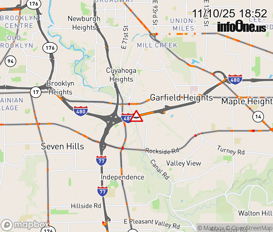 The right shoulder is blocked on I-480 West Express beyond Transportation Blvd/E 98th St, due to a crash. Updated: Mon 11/10/25 6:52 PM EST ![]() Updated: Mon 11/10/25 6:52 PM EST |