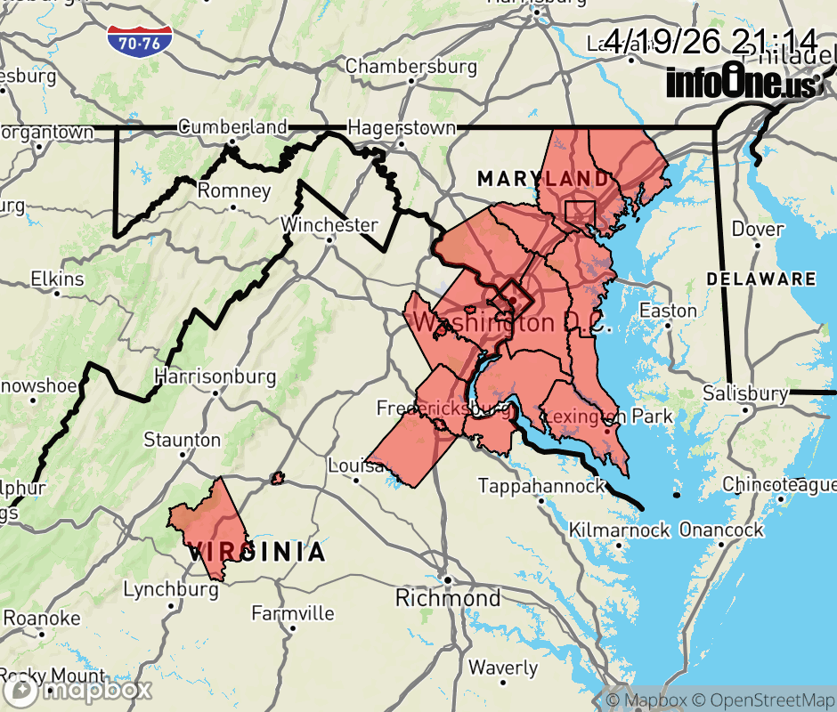 Canceled 4/19/26 11:36 PM Freeze Watch issued April 19 at 9:13PM EDT until April 21 at 10:00AM EDT by NWS Baltimore MD/Washington DC * WHAT... Sub-freezing temperatures as low as 31 possible. * WHERE... Portions of DC, central, northern, and southern Maryland, and central and northern Virginia. * WHEN... From late Monday night through Tuesday morning. * IMPACTS... Frost and freeze conditions could kill crops, other sensitive vegetation and possibly damage unprotected outdoor plumbing. ![]() |