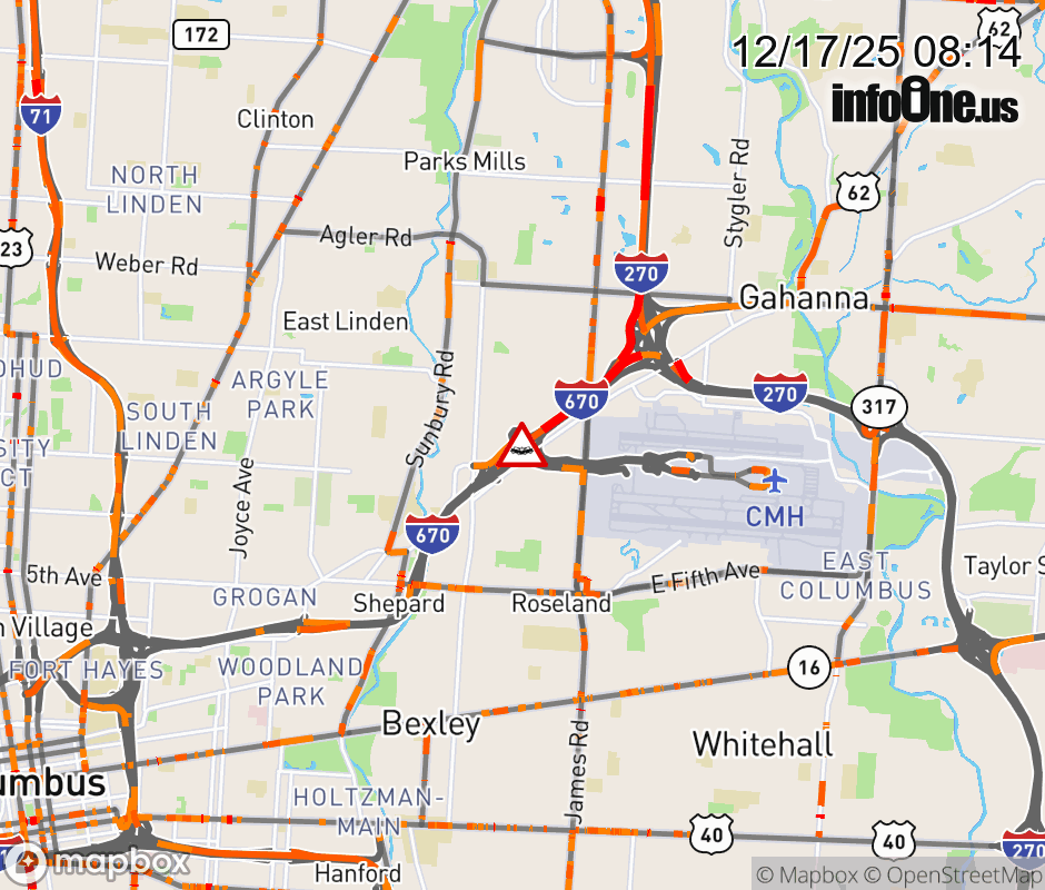 The left lane is blocked on I-670/US-62 West at Airport/Cassady Ave/Stelzer Rd, due to a crash. ![]() |