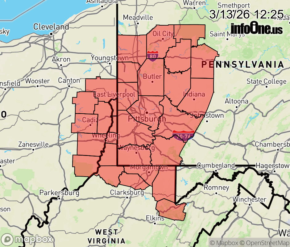 Canceled 3/13/26 4:06 PM Wind Advisory issued March 13 at 12:24PM EDT until March 14 at 12:00AM EDT by NWS Pittsburgh PA * WHAT... Southwest winds 20 to 30 mph with gusts up to 50 mph. * WHERE... Portions of east central Ohio, northwest, southwest, and western Pennsylvania, and northern and the northern panhandle of West Virginia. * WHEN... Until midnight EDT tonight. * IMPACTS... Gusty winds will blow around unsecured objects. Tree limbs could be blown down and a few power outages may result. ![]() |