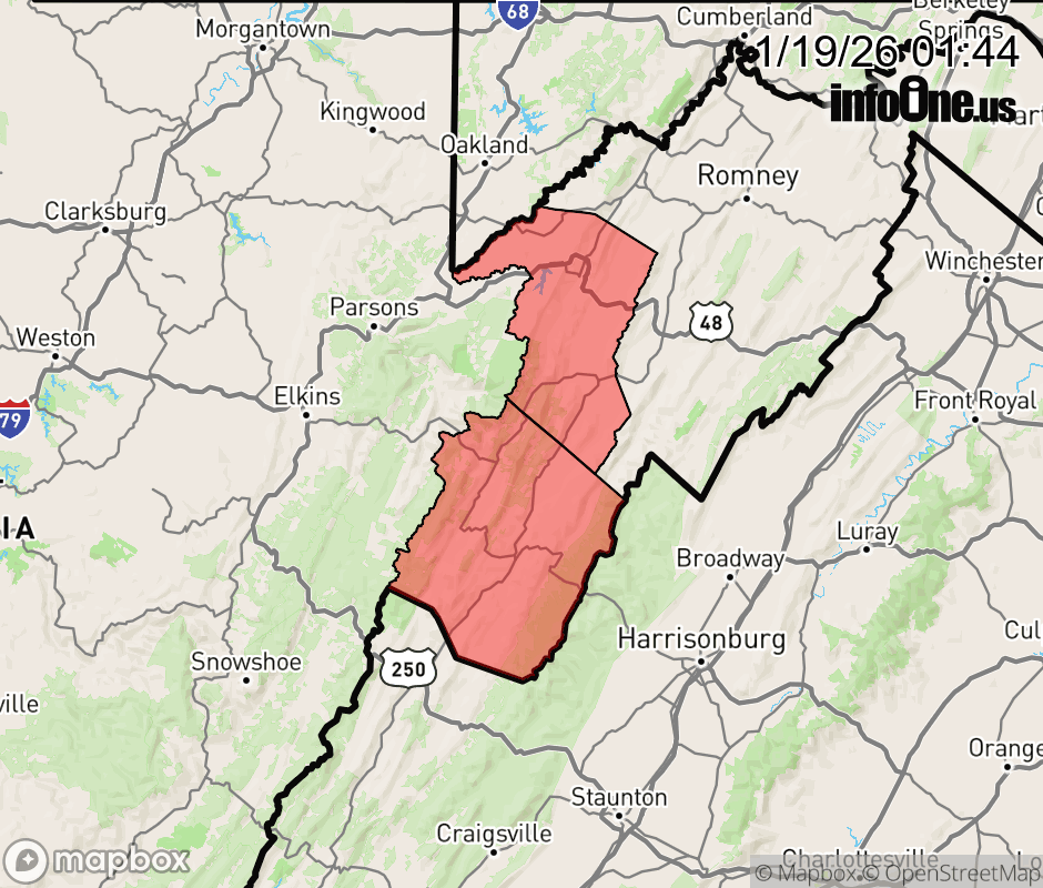 Canceled 1/19/26 2:01 AM Extreme Cold Warning issued January 19 at 1:42AM EST until January 20 at 1:00PM EST by NWS Baltimore MD/Washington DC * WHAT... For the Wind Advisory, west winds 20 to 30 mph with gusts up to 50 mph. For the Extreme Cold Warning, dangerously cold wind chills of 20 to 30 below zero expected. * WHERE... Western Grant and Western Pendleton Counties. * WHEN... For the Wind Advisory, from 8 AM this morning to 8 PM EST this evening. For the Extreme Cold Warning, from 8 PM this evening to 1 PM EST Tuesday. * IMPACTS... Gusty winds will blow around unsecured objects. Tree limbs could be blown down and a few power outages may result. The dangerously cold wind chills could cause frostbite on exposed skin in as little as 30 minutes. Frostbite and hypothermia will occur if unprotected skin is exposed to these temperatures. * ADDITIONAL DETAILS... The coldest wind chills will be at elevations above 3500 feet between midnight tonight and 9 AM Tuesday. ![]() |
