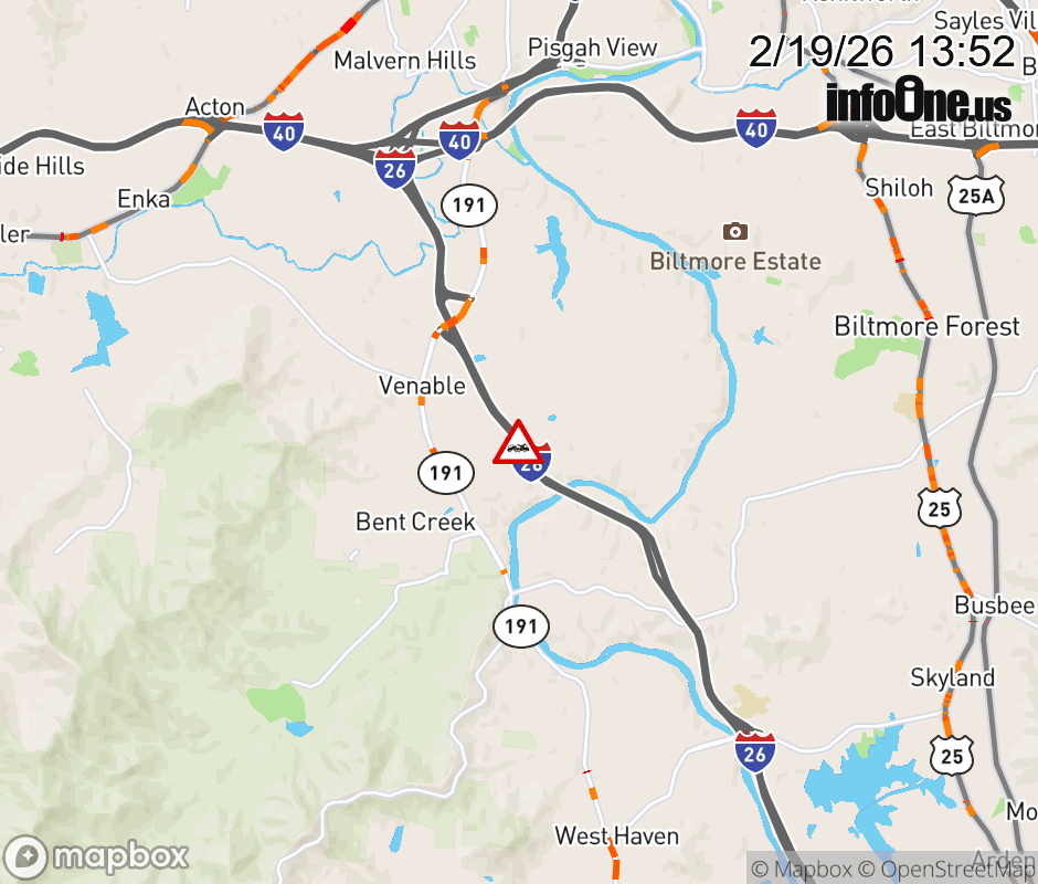 The right lane is closed 1 mile east of Exit 33, NC 191 (Brevard Road). ![]() |