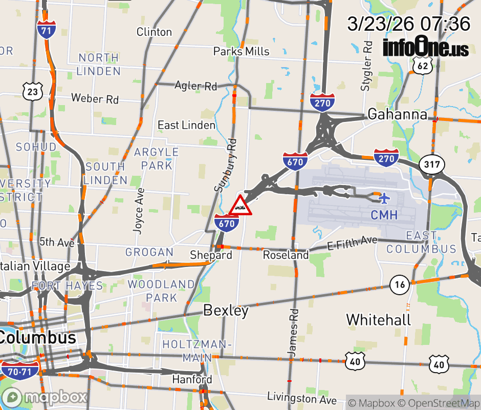 The left shoulder is blocked on I-670/US-62 West beyond Airport/Cassady Ave/Stelzer Rd, due to a disabled vehicle. ![]() |
