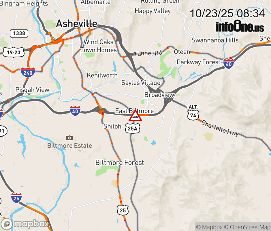 The left lane is closed at Exit 51, US 25 Alt (Sweeten Creek Road) due to a disabled vehicle. Updated: Thu 10/23/25 8:34 AM EDT ![]() Updated: Thu 10/23/25 8:34 AM EDT |