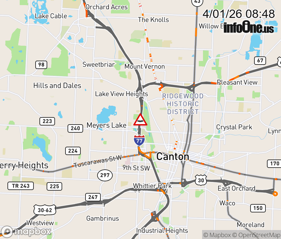 The left lane is blocked on I-77 North/US-62 East beyond 13Th St NW, due to a crash. ![]() |