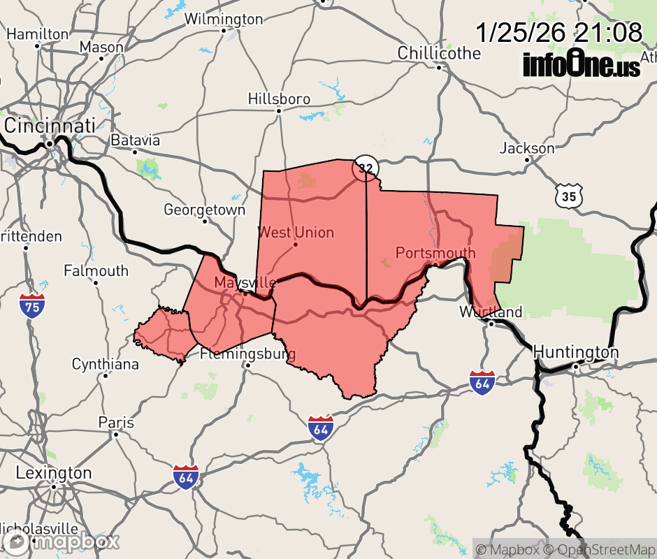 Canceled 1/26/26 1:36 AM Winter Storm Warning issued January 25 at 9:07PM EST until January 26 at 12:00PM EST by NWS Wilmington OH * WHAT... Continued hazardous travel due to accumulated snow and sleet. * WHERE... In Kentucky, Lewis, Mason, and Robertson Counties. In Ohio, Adams and Scioto Counties. * WHEN... Until noon EST Monday. * IMPACTS... Travel conditions remain very difficult. Plan on slippery road conditions. The hazardous conditions will impact the Monday morning commute. ![]() |