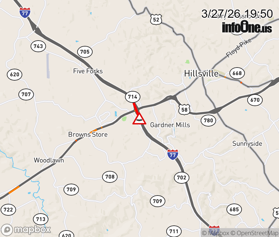 On I-77 at mile marker 14.7 in the County of Carroll, motorists can expect delays due to a vehicle crash. The south entrance ramp narrows. Traffic backups are approximately 1.0 mile. Updated: Fri 3/27/26 7:50 PM EDT ![]() Updated: Fri 3/27/26 7:50 PM EDT |