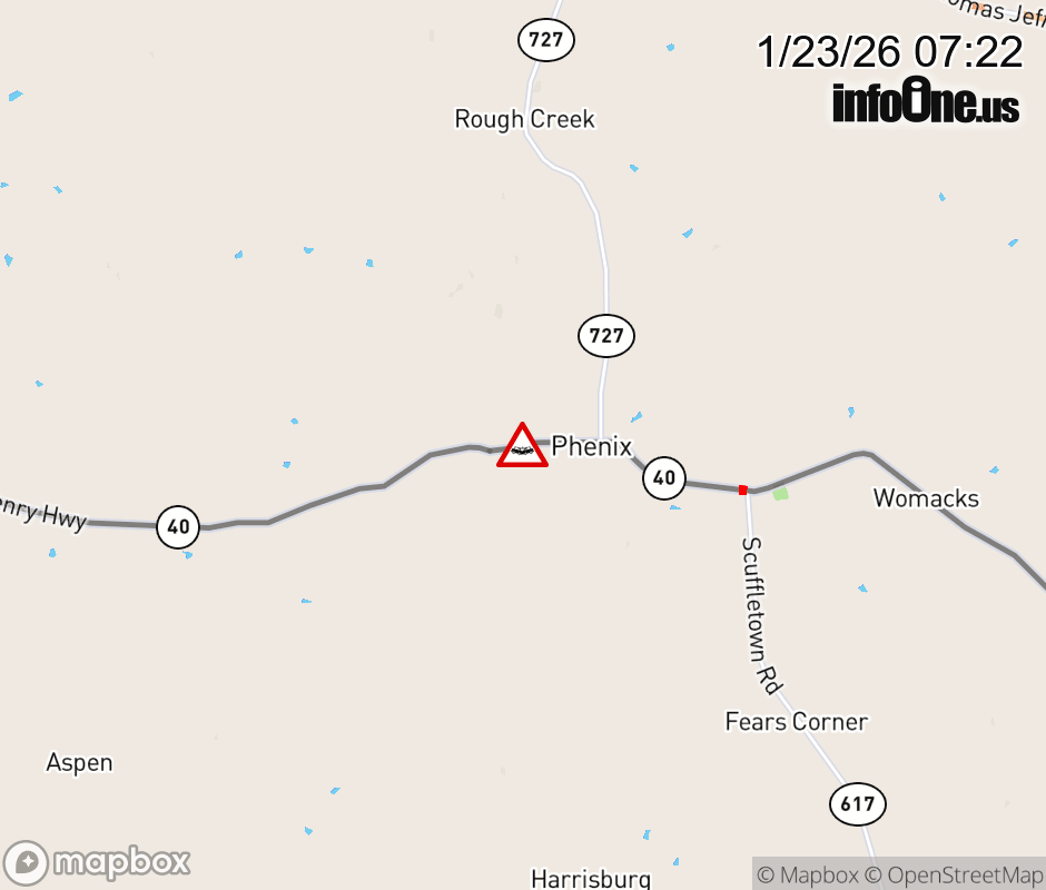 On VA-40 in the County of Charlotte, in the vicinity of County/City/Town Line: PHENIX, motorists can expect delays due to a tractor trailer crash. All east lanes are closed. Updated: Fri 1/23/26 7:22 AM EST ![]() Updated: Fri 1/23/26 7:22 AM EST |
