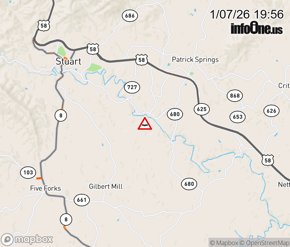 On Rt. 683 North in the County of Patrick, in the vicinity of Big A School Rd; Rt. 682N/S (Patrick County), motorists can expect delays due to a vehicle crash. Lane closures exist. ![]() |