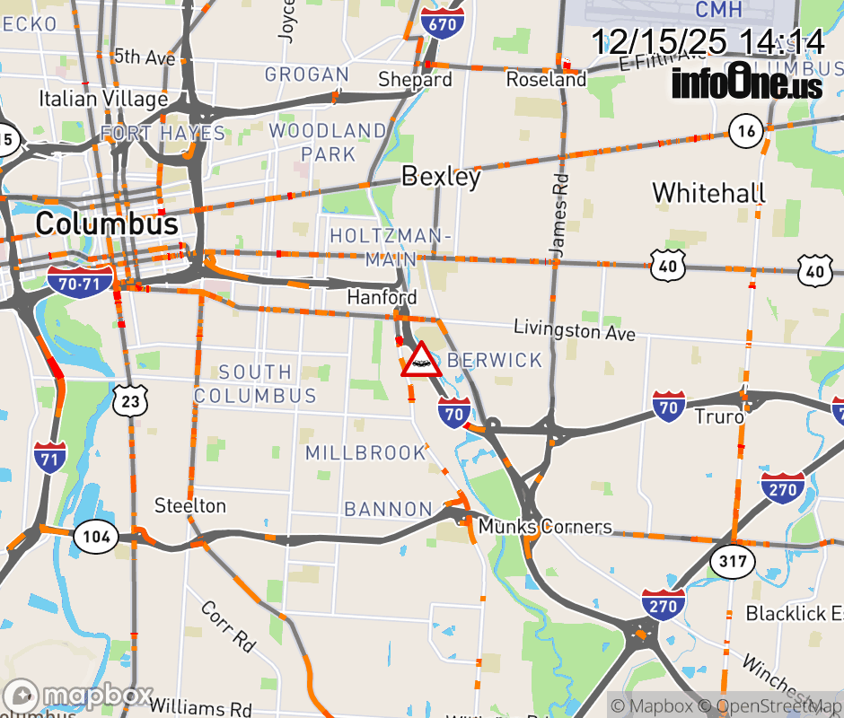 The 2 left lanes are blocked on I-70 West beyond US-33, due to a crash. Updated: Mon 12/15/25 2:14 PM EST ![]() Updated: Mon 12/15/25 2:14 PM EST |
