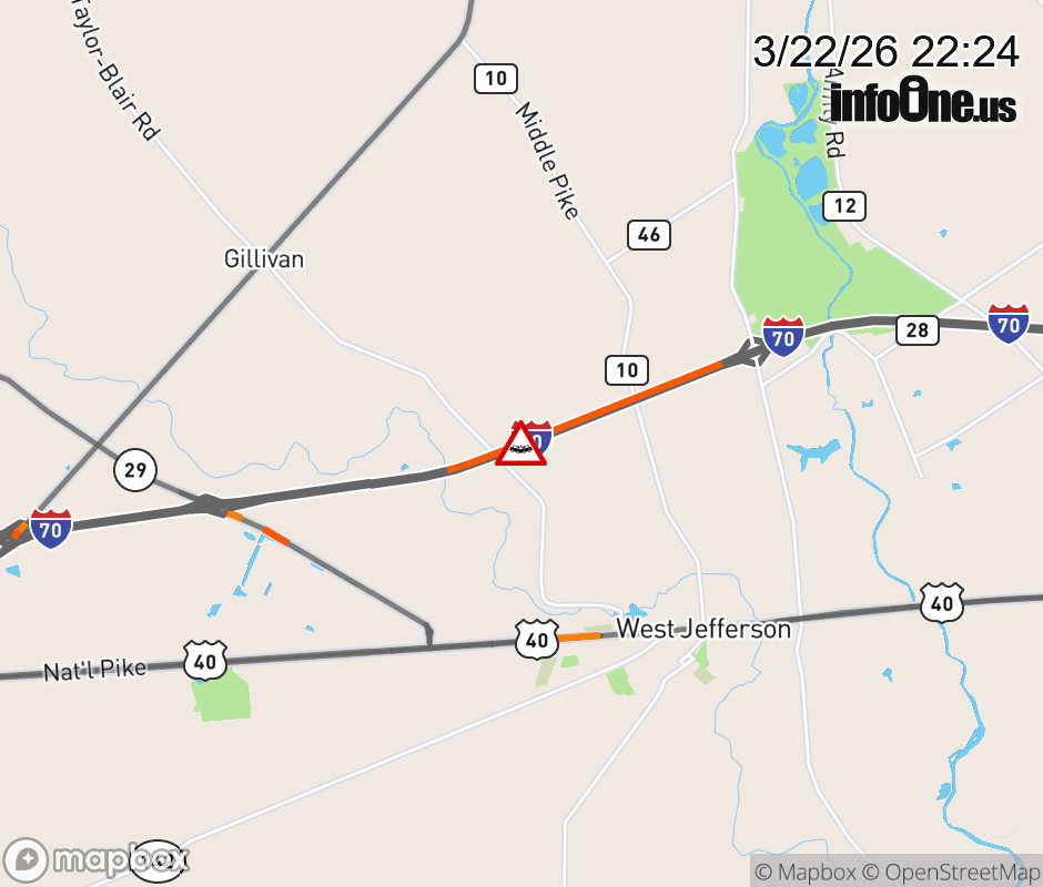 The 2 left lanes are blocked on I-70 West beyond SR-142/West Jefferson/Plain City, due to a crash. ![]() |