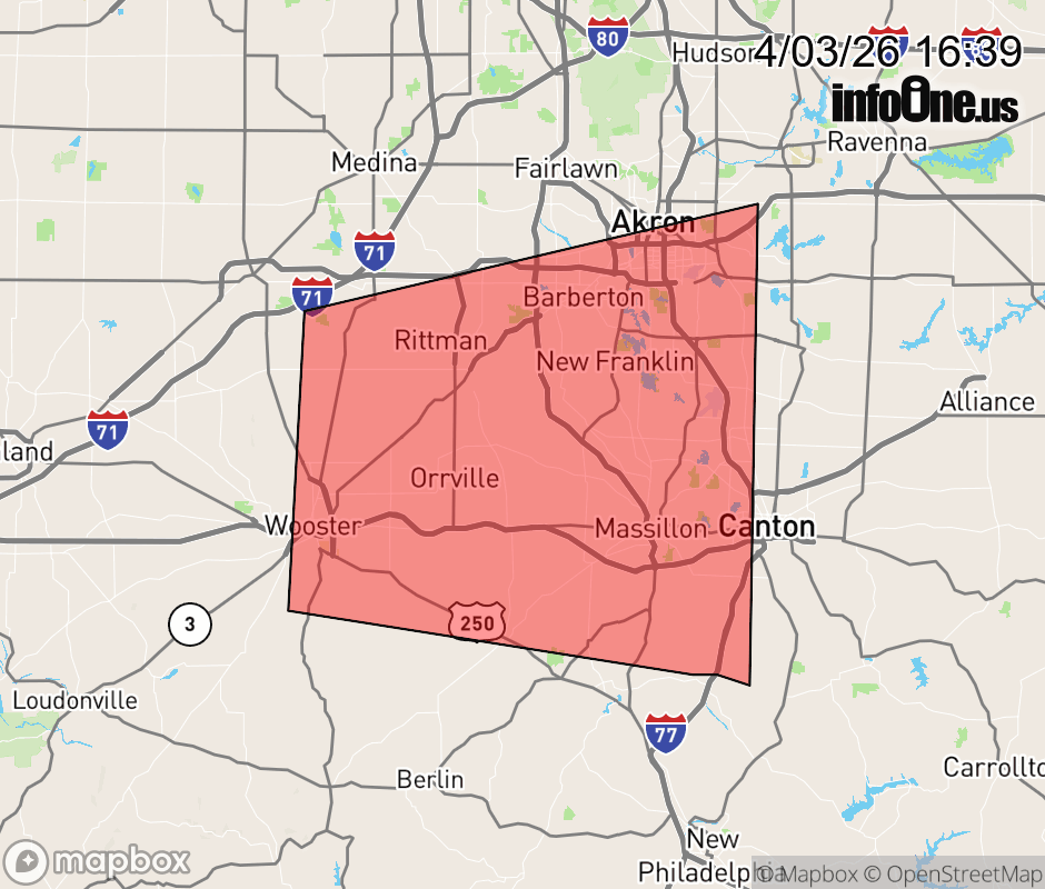 Canceled 4/3/26 4:49 PM Severe Thunderstorm Warning issued April 3 at 4:38PM EDT until April 3 at 5:30PM EDT by NWS Cleveland OH SVRCLE The National Weather Service in Cleveland has issued a * Severe Thunderstorm Warning for... Southeastern Medina County in northeastern Ohio... Western Stark County in northeastern Ohio... Southern Summit County in northeastern Ohio... Eastern Wayne County in northeastern Ohio... * Until 530 PM EDT. * At 438 PM EDT, a severe thunderstorm was located near Orrville, or near Wooster, moving east at 30 mph. HAZARD...60 mph wind gusts and penny size hail. SOURCE...Radar indicated. IMPACT...Expect damage to trees and power lines. * Locations impacted include... Akron, Canton, Wooster, Massillon, Barberton, Green, Wadsworth, Tallmadge, North Canton, Orrville, Rittman, Mogadore, Doylestown, Creston, Brewster, Navarre, Dalton, Mount Eaton, New Franklin, and Norton. ![]() |