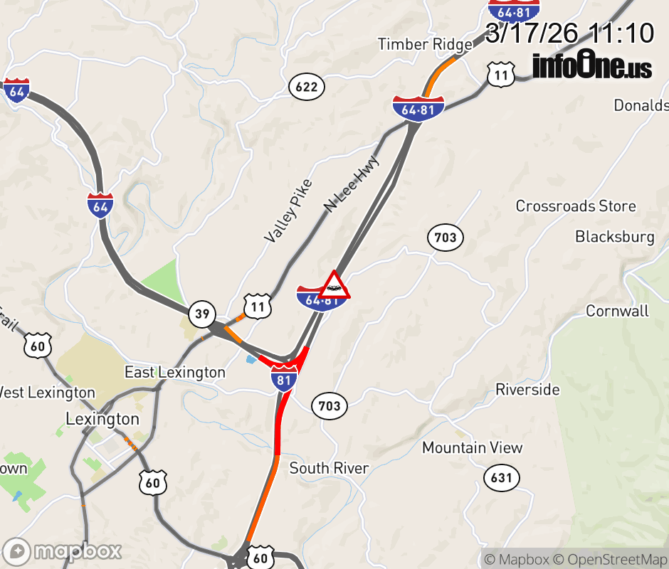 On I-81 North at mile marker 192.6 in the County of Rockbridge, motorists can expect delays due to a tractor trailer crash. Traffic backups are approximately 3.5 miles. Updated: Tue 3/17/26 11:10 AM EDT ![]() Updated: Tue 3/17/26 11:10 AM EDT |