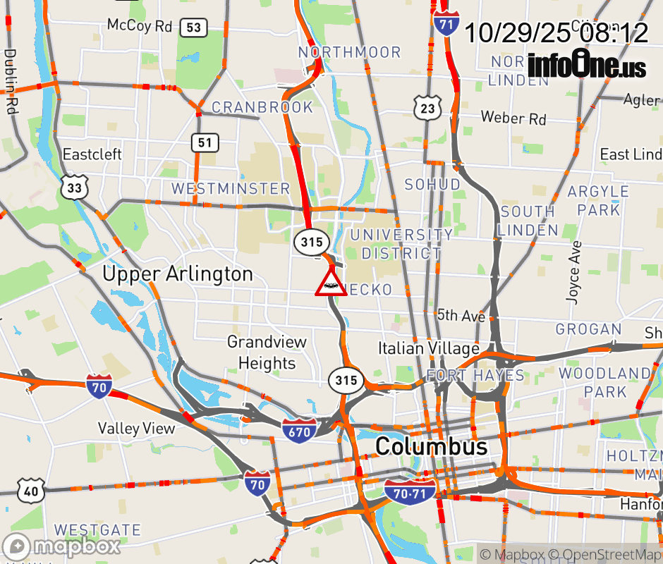 The right lane is blocked on SR-315 South beyond Kinnear Rd/Olentangy Rd, due to a crash. Updated: Wed 10/29/25 8:12 AM EDT ![]() Updated: Wed 10/29/25 8:12 AM EDT |