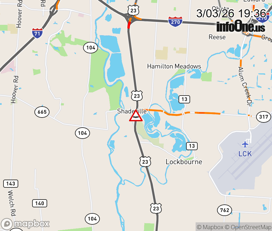 The left lane is closed on US-23 North at London-Groveport Rd W expect lane closures on US-23 South at London-Groveport Rd W, due to a crash. Updated: Tue 3/3/26 7:36 PM EST ![]() Updated: Tue 3/3/26 7:36 PM EST |