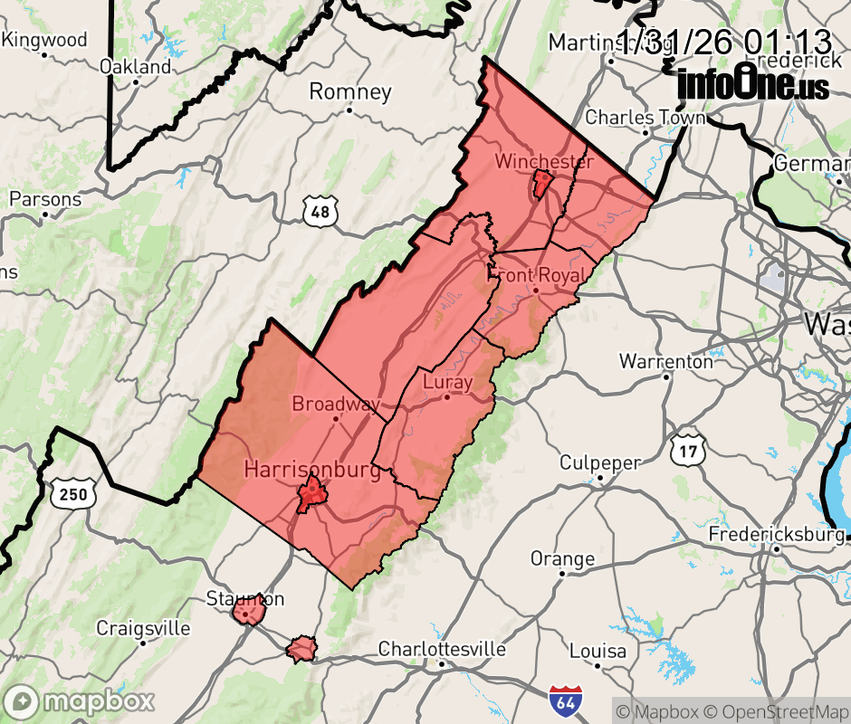 Canceled 1/31/26 9:48 AM Cold Weather Advisory issued January 31 at 1:12AM EST until February 1 at 1:00PM EST by NWS Baltimore MD/Washington DC * WHAT... Bitter cold wind chills as low as 17 below expected. * WHERE... Clarke, Frederick VA, Page, Shenandoah, Warren, Augusta, and Rockingham Counties. * WHEN... From 10 PM this evening to 1 PM EST Sunday. * IMPACTS... The cold wind chills as low as 15 below zero could result in hypothermia or frostbite if precautions are not taken. ![]() |