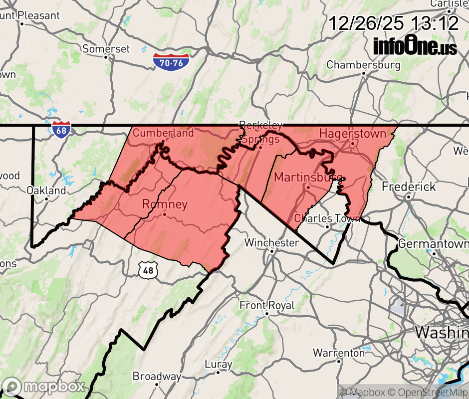 Canceled 12/26/25 5:55 PM Winter Weather Advisory issued December 26 at 1:11PM EST until December 26 at 11:00PM EST by NWS Baltimore MD/Washington DC * WHAT... Freezing rain. Additional ice accumulations around a glaze to a tenth of an inch. * WHERE... Portions of north central and western Maryland and eastern and panhandle West Virginia. * WHEN... Until 11 PM EST this evening. * IMPACTS... Plan on slippery road conditions. The hazardous conditions will impact this evening's commute. * ADDITIONAL DETAILS... Freezing rain with some sleet mixing in will continue through the afternoon and evening. Temperatures will continue rising above freezing from south to north into the evening, allowing more places to change to rain, although some locations may hover near the freezing mark through tonight. ![]() |