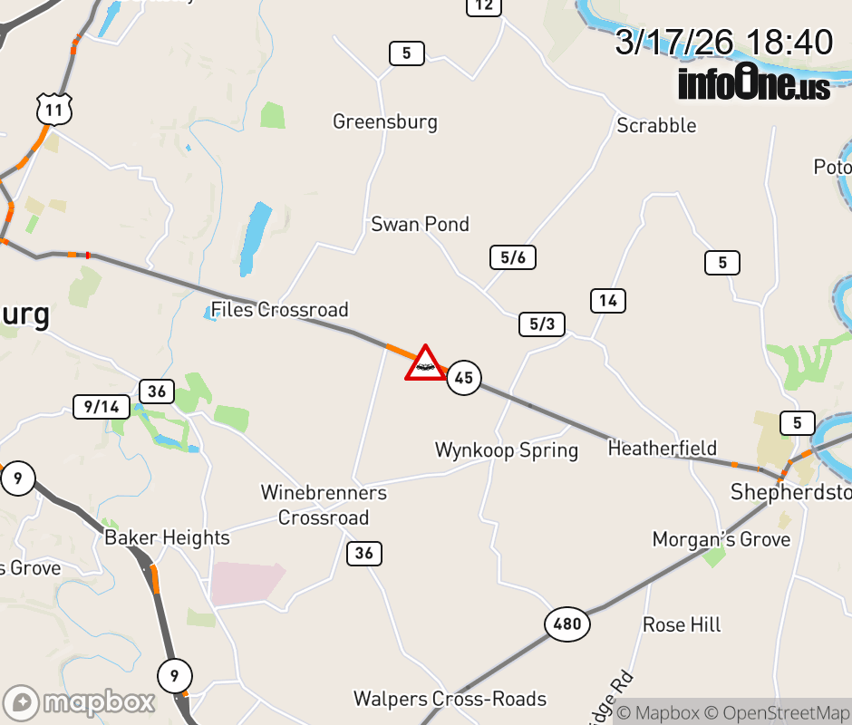 Vehicle Crash on WV-45 (4700 BLK of Shepherdstown Rd) in Martinsburg. Updated: Tue 3/17/26 6:40 PM EDT ![]() Updated: Tue 3/17/26 6:40 PM EDT |