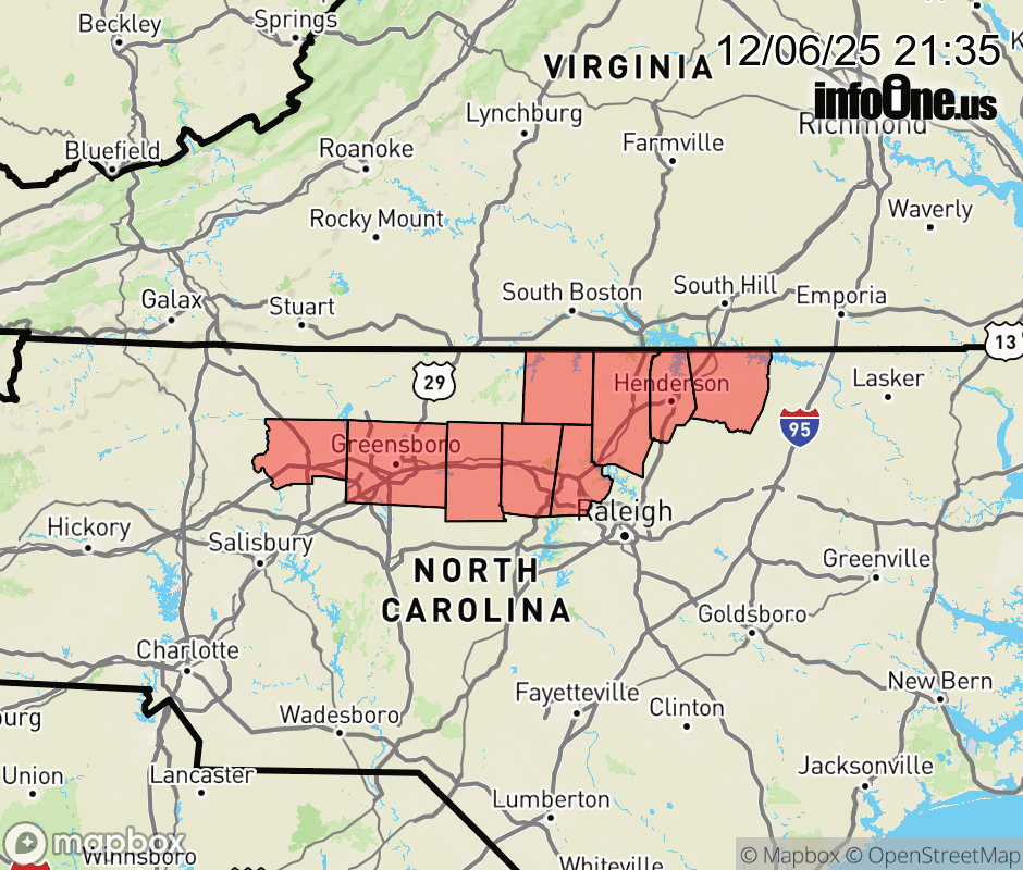 Canceled 12/6/25 10:54 PM Freezing Fog Advisory issued December 6 at 9:34PM EST until December 7 at 9:00AM EST by NWS Raleigh NC * WHAT... Visibility one quarter mile or less in freezing fog. * WHERE... Alamance, Durham, Forsyth, Granville, Guilford, Orange, Person, Vance, and Warren Counties. * WHEN... Until 9 AM EST Sunday. * IMPACTS... Low visibility could make driving conditions hazardous. Black ice can lead to slick travel. ![]() |