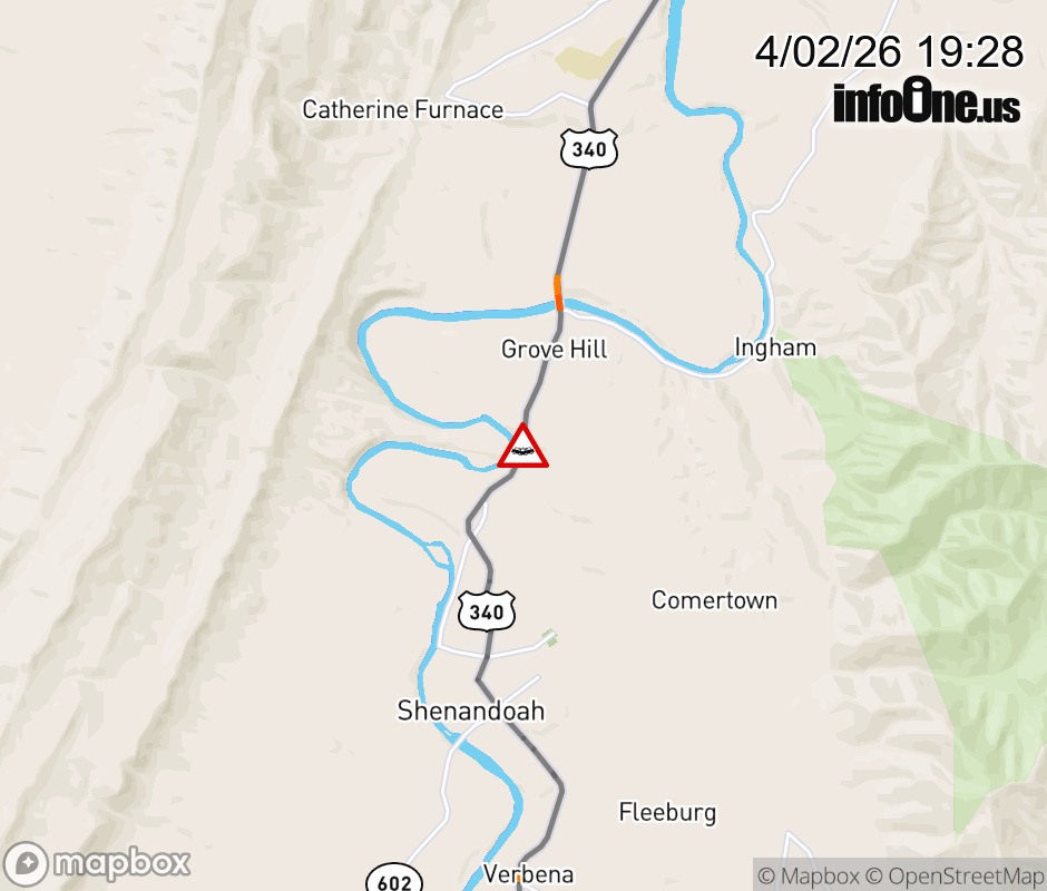 On US-340 North in the County of Page, in the vicinity of Mcdaniel Ln; Rt. 710E/W (Page County), motorists can expect delays due to a tractor trailer crash. Updated: Thu 4/2/26 7:28 PM EDT ![]() Updated: Thu 4/2/26 7:28 PM EDT |