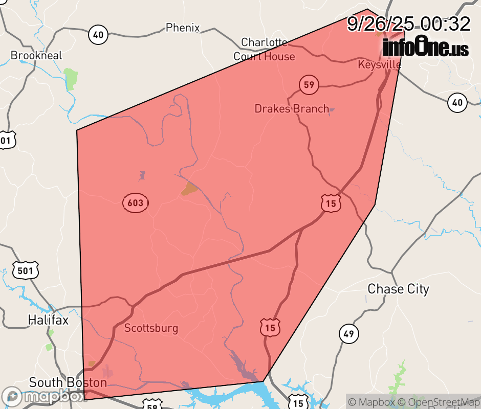 Canceled 9/26/25 1:00 AM Severe Thunderstorm Warning issued September 26 at 12:30AM EDT until September 26 at 1:30AM EDT by NWS Blacksburg VA SVRRNK The National Weather Service in BLACKSBURG has issued a * Severe Thunderstorm Warning for... Southern Charlotte County in south central Virginia... Central Halifax County in south central Virginia... * Until 130 AM EDT. * At 1230 AM EDT, a severe thunderstorm was located over Mt Laurel, or over Clover, moving east at 40 mph. HAZARD...60 mph wind gusts. SOURCE...Radar indicated. IMPACT...Expect damage to roofs, siding, and trees. * Locations impacted include... South Boston... Keysville... Charlotte Court House... Redoak... Clover... Drakes Branch... and Scottsburg. ![]() |
