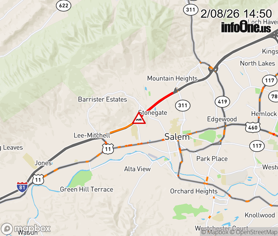 On I-81 South at mile marker 138.6 in the County of Roanoke, motorists can expect delays due to a disabled vehicle. Traffic backups are approximately 1.0 mile. Updated: Sun 2/8/26 2:50 PM EST ![]() Updated: Sun 2/8/26 2:50 PM EST |