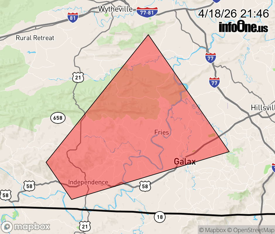 Canceled 4/18/26 10:00 PM Special Weather Statement issued April 18 at 9:44PM EDT by NWS Blacksburg VA At 944 PM EDT, Doppler radar was tracking a strong thunderstorm over Independence, moving northeast at 40 mph. HAZARD...Wind gusts up to 40 mph and pea size hail. SOURCE...Radar indicated. IMPACT...Gusty winds could knock down tree limbs and blow around unsecured objects. Locations impacted include... Galax... Independence... Fries... Byllesby... Elk Creek... Spring Valley... and Ivanhoe. ![]() |