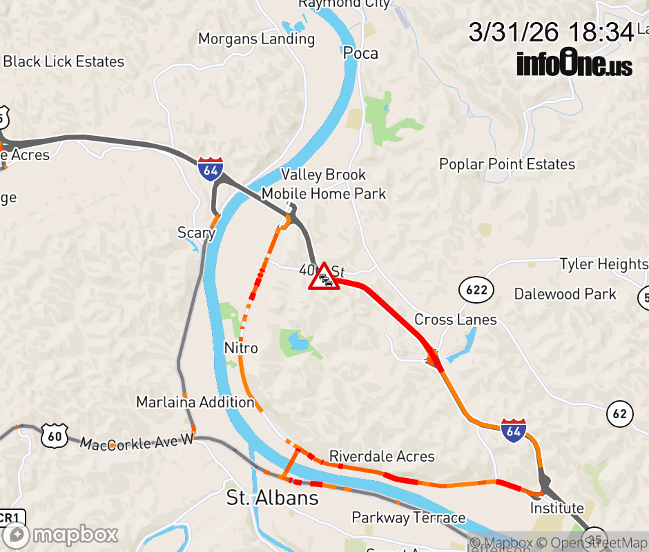 Vehicle Fire on I-64W at Mile Marker 45.5. The westbound right lane is closed. Updated: Tue 3/31/26 6:34 PM EDT ![]() Updated: Tue 3/31/26 6:34 PM EDT |