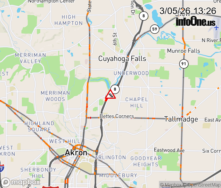 The left lane is blocked on SR-8 South/SR-59 West beyond Howe Ave/Cuyahoga Falls Ave, due to flooding. ![]() |