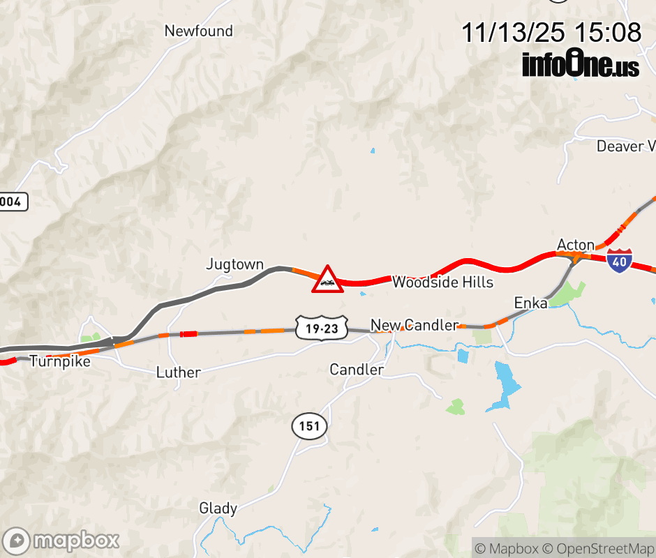 The right shoulder is closed 4 miles west of Exit 44, US 19/23/74 ALT (Smokey Park Highway). Updated: Thu 11/13/25 3:08 PM EST ![]() Updated: Thu 11/13/25 3:08 PM EST |
