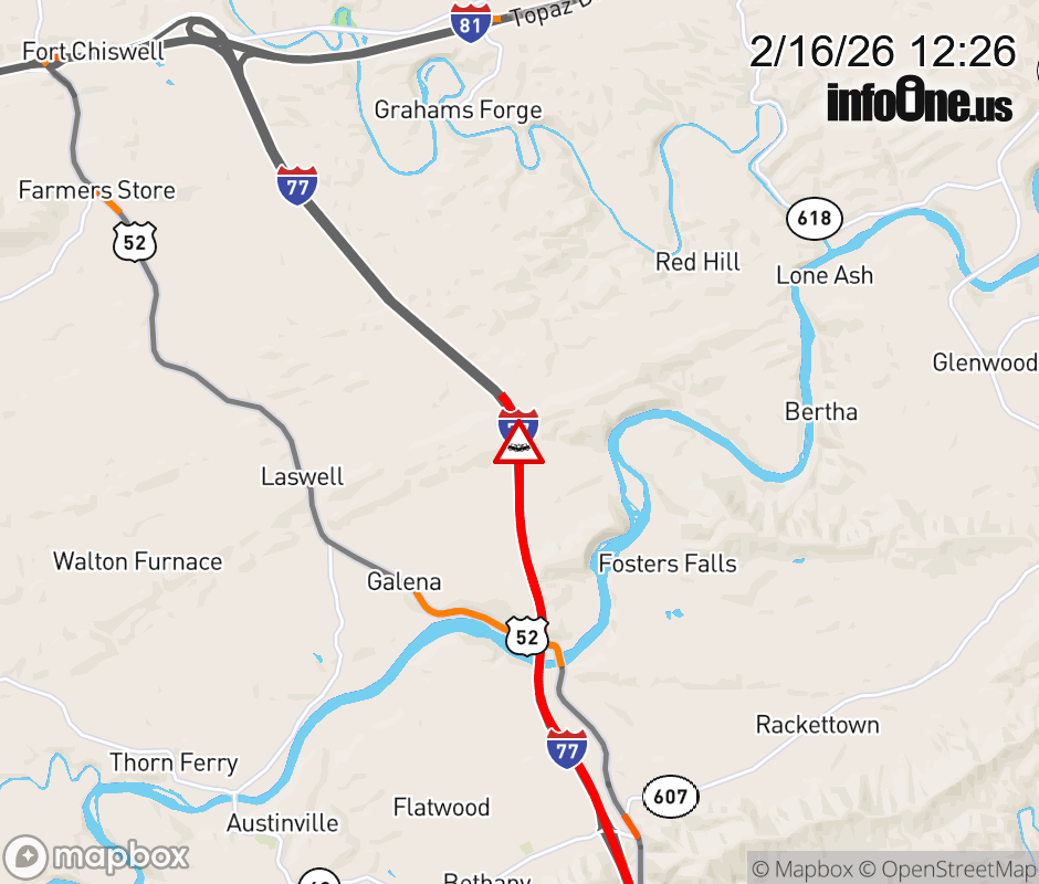 On I-77 at mile marker 27.8 in the County of Wythe, motorists can expect delays due to a multi-vehicle crash. The north left shoulder and left lane are closed. Updated: Mon 2/16/26 12:26 PM EST ![]() Updated: Mon 2/16/26 12:26 PM EST |
