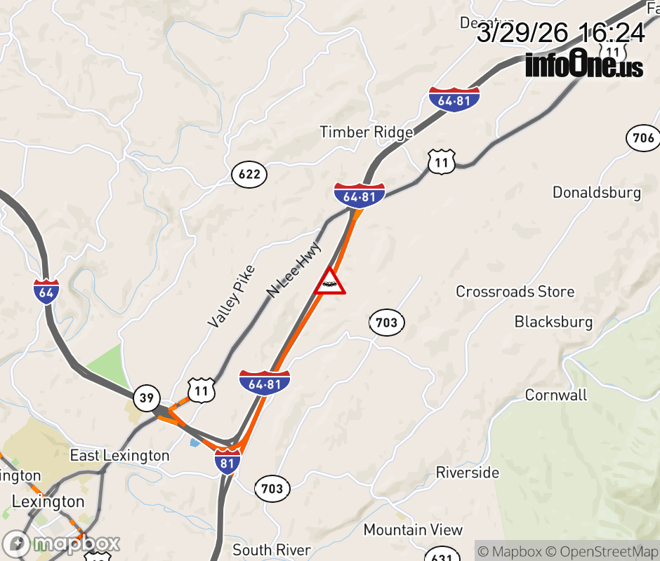 On I-81 North at mile marker 194 in the County of Rockbridge, motorists can expect delays due to a vehicle crash. Traffic backups are approximately 2.0 miles. Updated: Sun 3/29/26 4:24 PM EDT ![]() Updated: Sun 3/29/26 4:24 PM EDT |