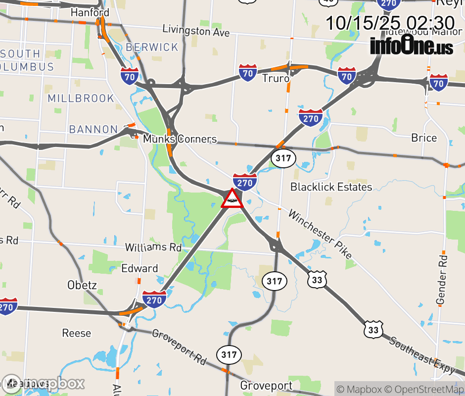 The right shoulder is blocked on I-270 South at US-33 East, due to a crash. Updated: Wed 10/15/25 2:30 AM EDT ![]() Updated: Wed 10/15/25 2:30 AM EDT |