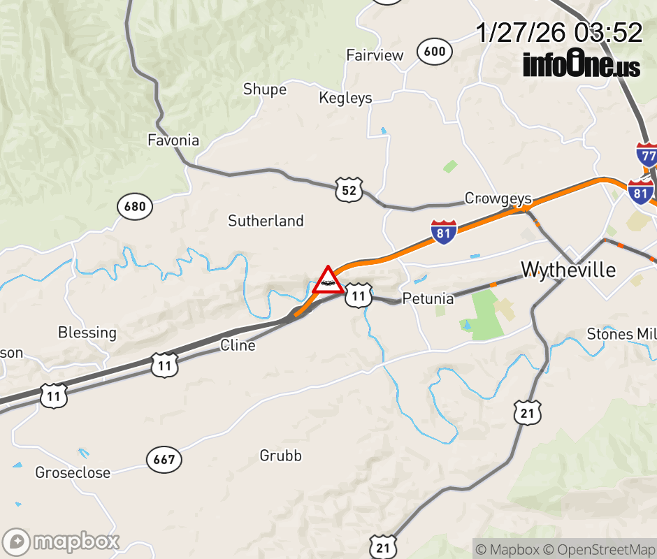 On I-81 at mile marker 68 in the County of Wythe, motorists can expect delays due to a vehicle crash. The north right shoulder is closed. ![]() |