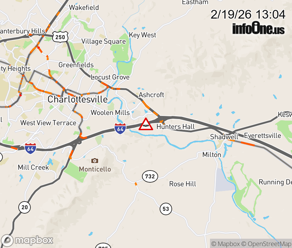 On I-64 at mile marker 124 in the County of Albemarle, motorists can expect delays due to a vehicle crash. The east right shoulder is closed. Updated: Thu 2/19/26 1:04 PM EST ![]() Updated: Thu 2/19/26 1:04 PM EST |